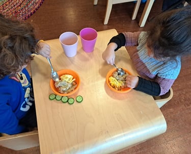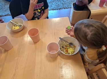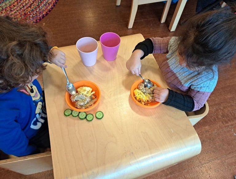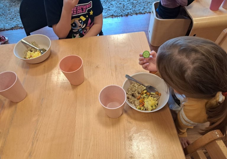 We provide homemade, fresh, balanced meals and snacks, with local organic ingredients, each day to support children’s growth, energy, and well-being, while accommodating allergies and dietary needs to ensure every child feels safe, included, and well cared for.